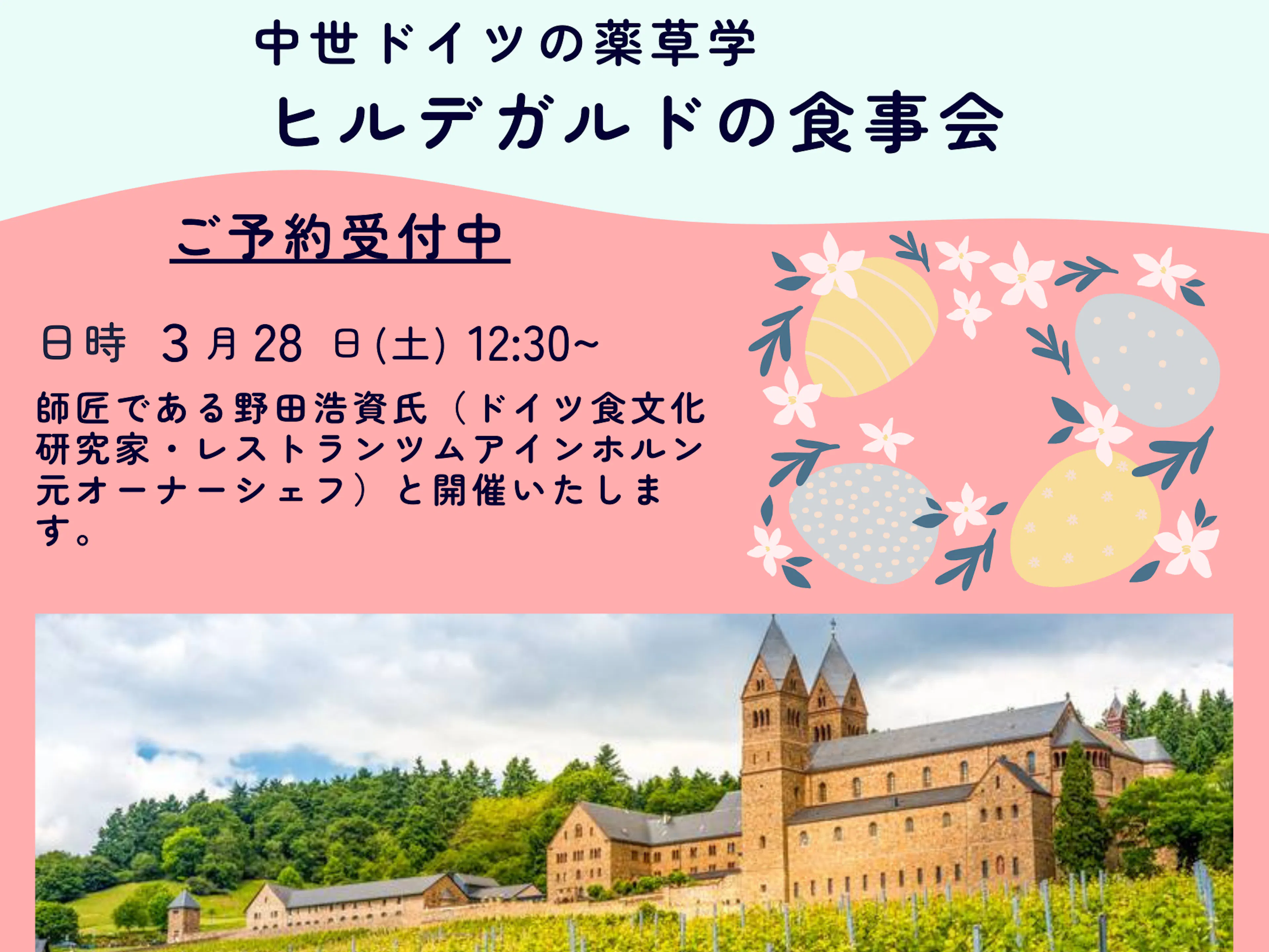 中世ドイツの薬草学の祖ヒルデガルト・フォン・ビンゲンの食の教えをもとに作る料理を食べる会を開催いたします。ヒルデガルトの料理本「中世修道院の食卓」の著者であるドイツ食文化研究家の野田浩資氏が考案した”ヒルデガルト料理”を、照井勇次シェフと作ります。 参加申し込みは、Email:st.hildegardcook@gmail.comにメッセージをお送りください。 またはレストラングリューナーボーゲンま
