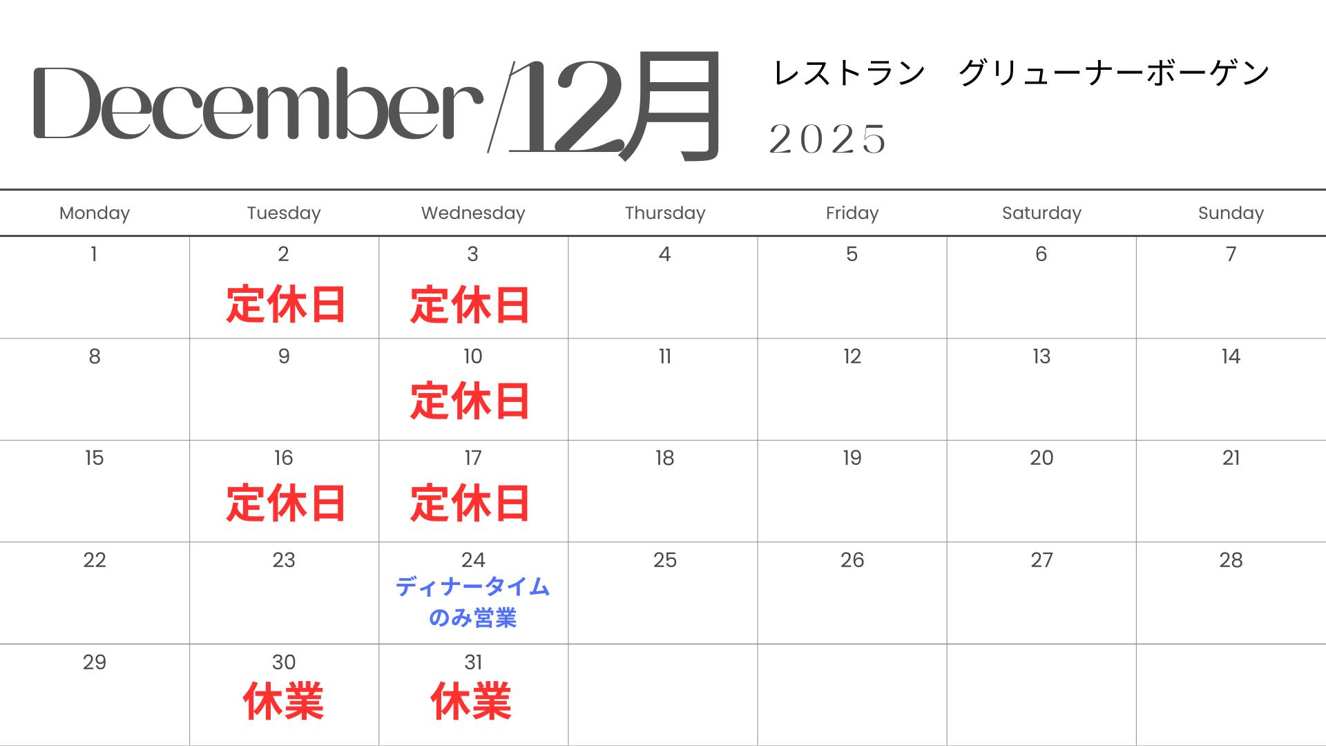 定休日 毎週水曜日と第1、第3火曜日 (12月24日水曜日はディナータイムのみ営業)